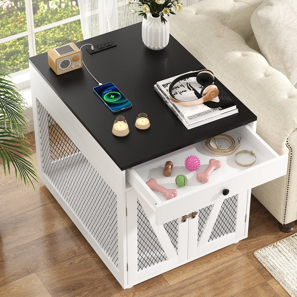 RichYa Furniture Style Dog Crate End Table, Wooden Dog Kennel with Dual USB Charging Station, for Dogs Under 40 lbs Indoor Use, White, M Size