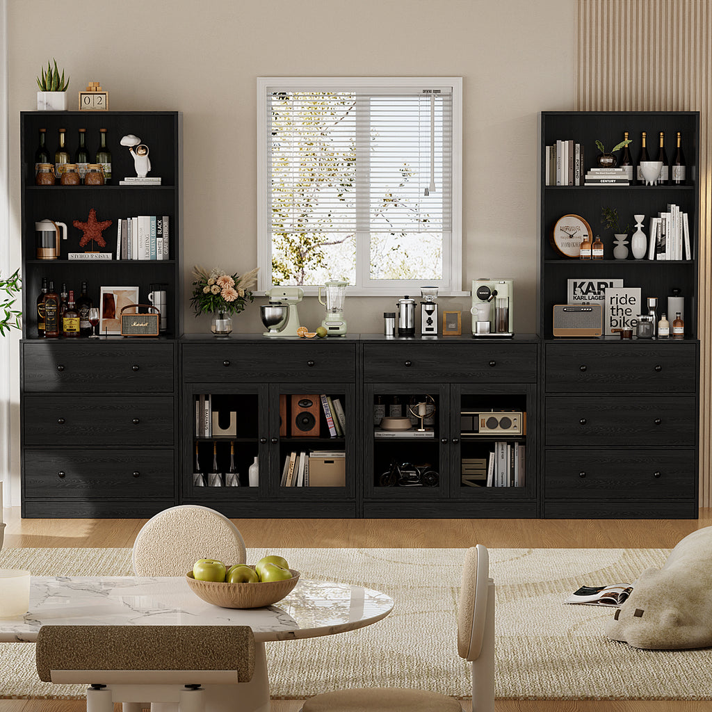 【Modular Furniture Cabinets】This combination pantry storage cabinet set features 6 open - shelf cabinets, 8 drawer units, and 4 glass - door storage cabinets. Mix and match to fit your space, making it ideal for living rooms, kitchens, or dining areas. Organize books, decor, kitchenware, or bar essentials in one cohesive system