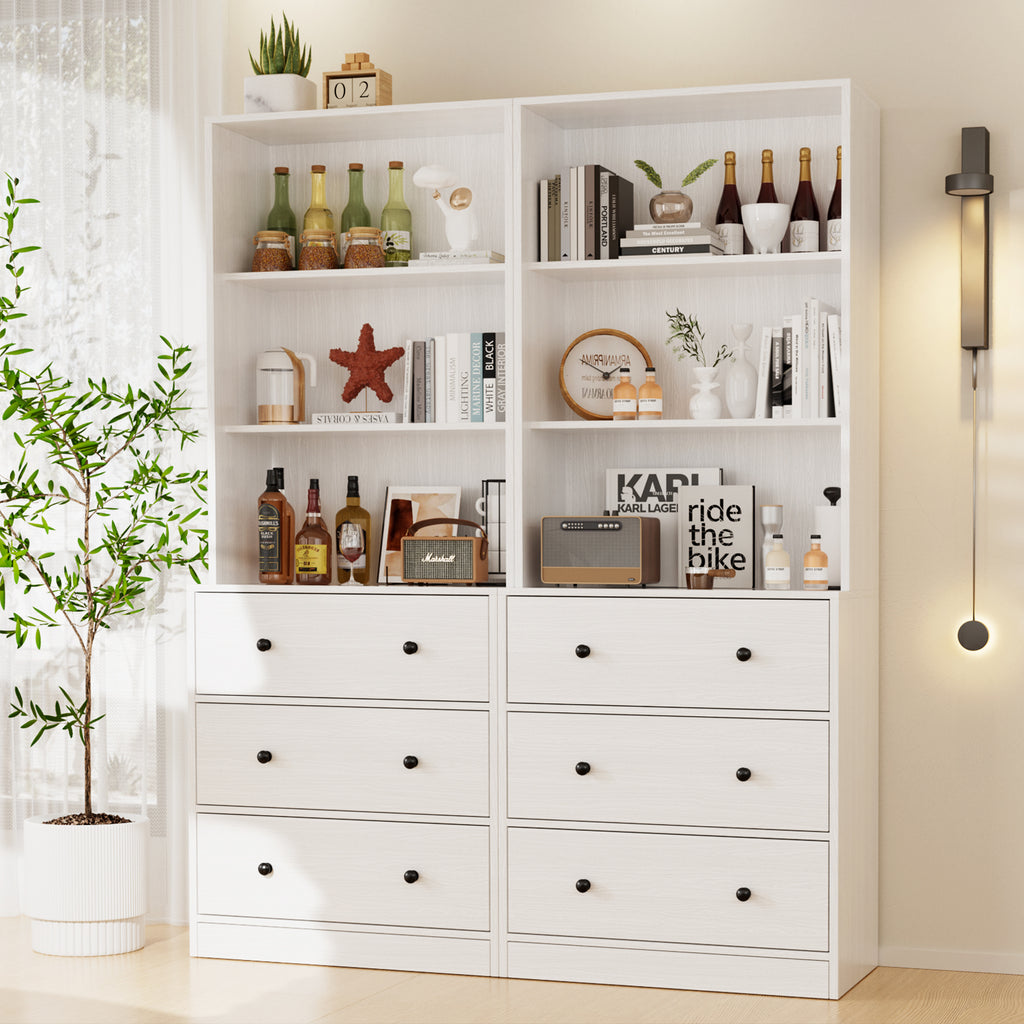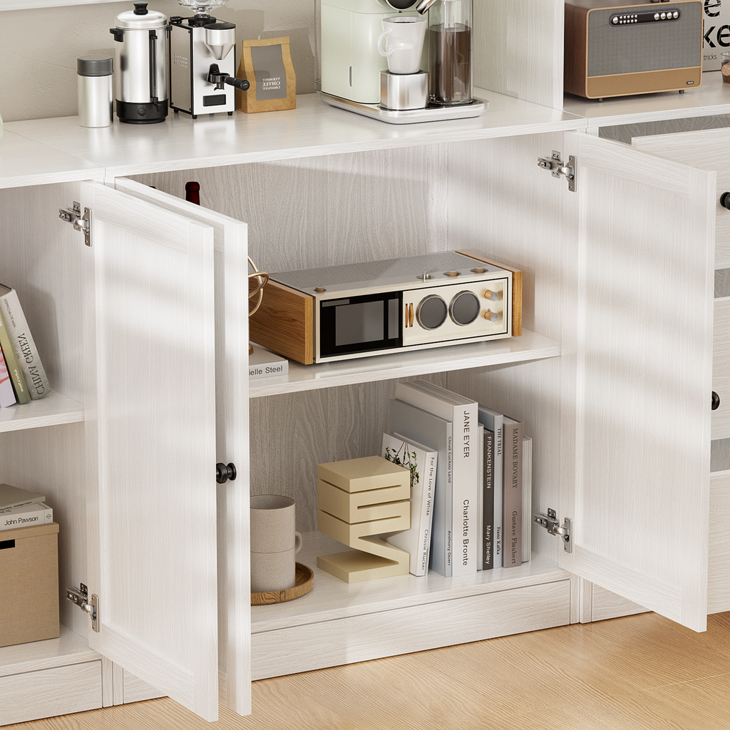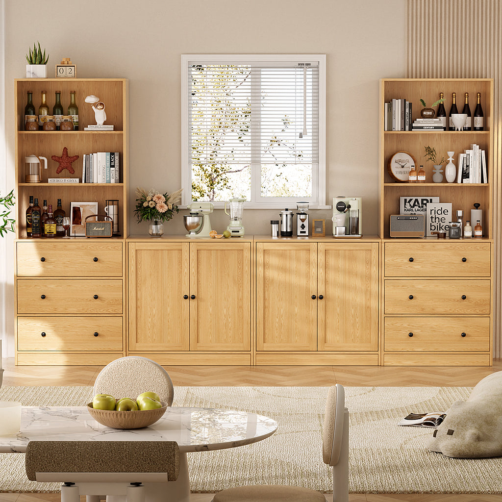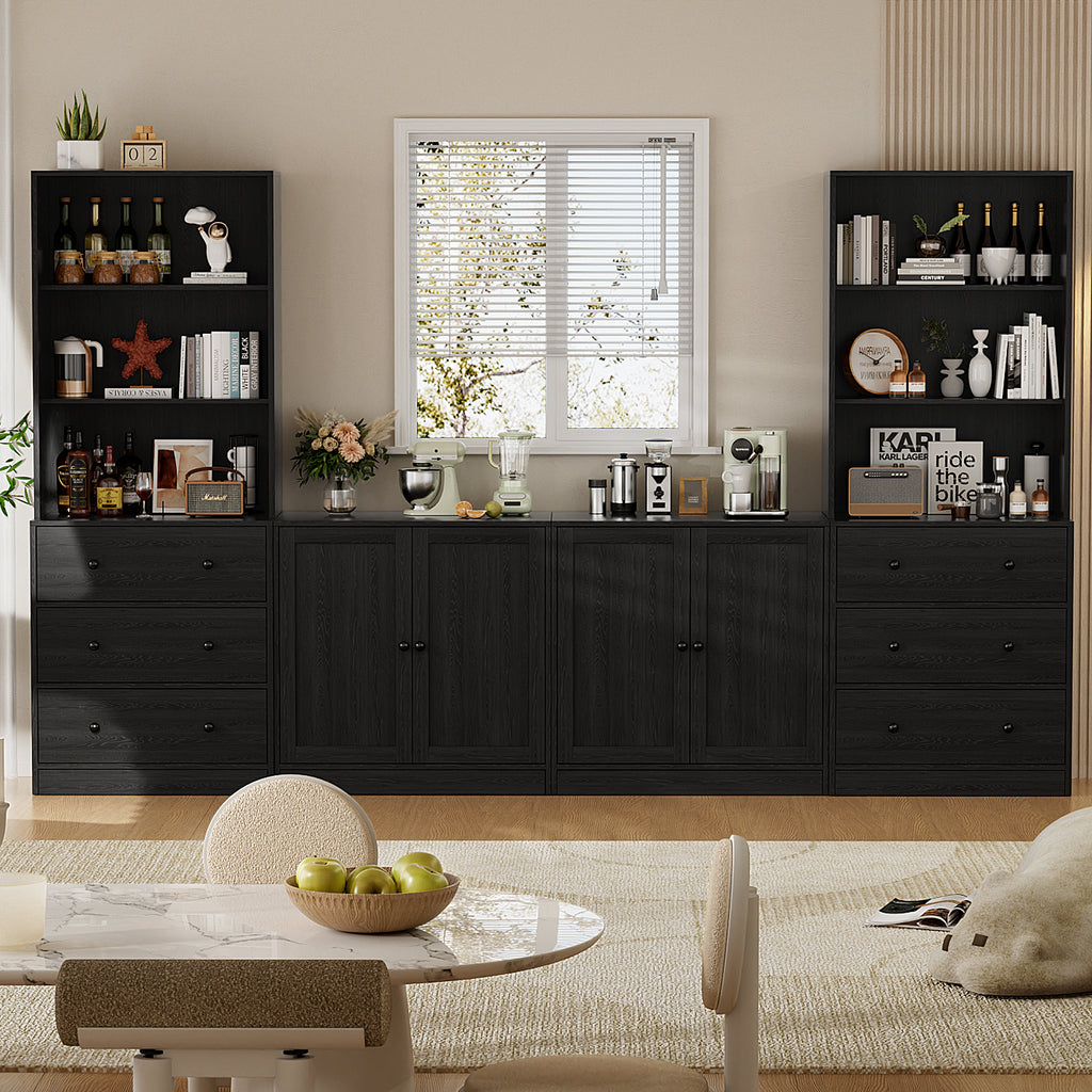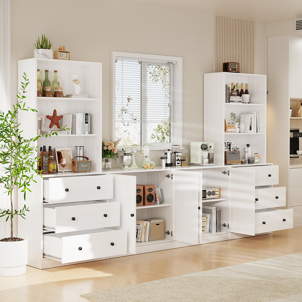 【Modular Furniture Cabinets】This combination pantry storage cabinet set features 6 open - shelf cabinets, 6 drawer units, and 4 door storage cabinets. Mix and match to fit your space, making it ideal for living rooms, kitchens, or dining areas. Organize books, decor, kitchenware, or bar essentials in one cohesive system