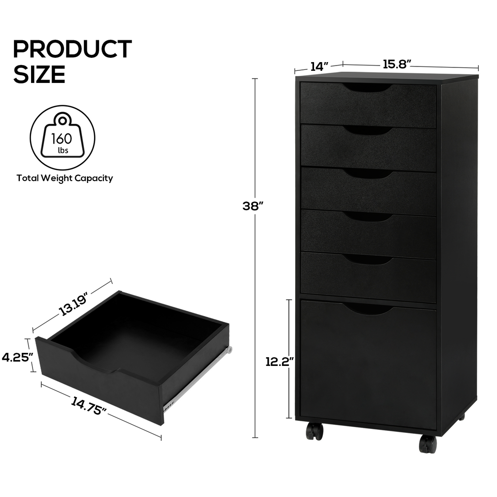 SPACIOUS STORAGE SPACE: The storage cabinet with drawers measures 15.80 "W x 14 "D x 38 "H. This black tall chest dresser has five drawers and one big sliding door storage cabinet for organizing all your belongings (files, books, daily clutter, etc.). Maximum weight capacity is 160 lbs.