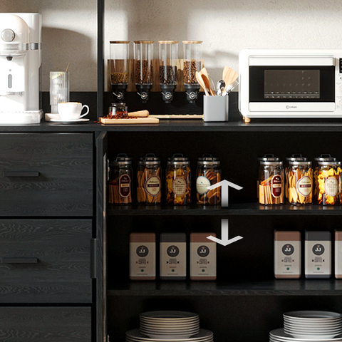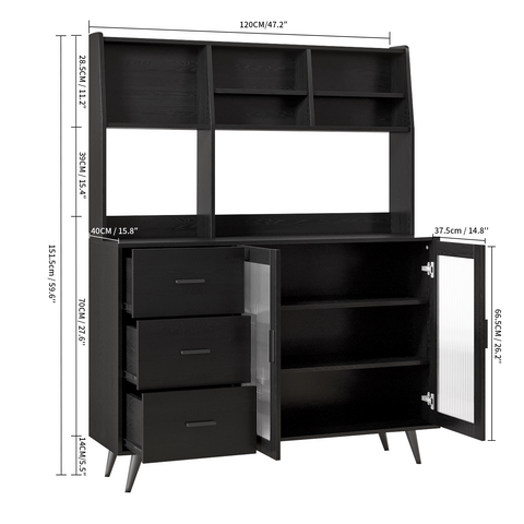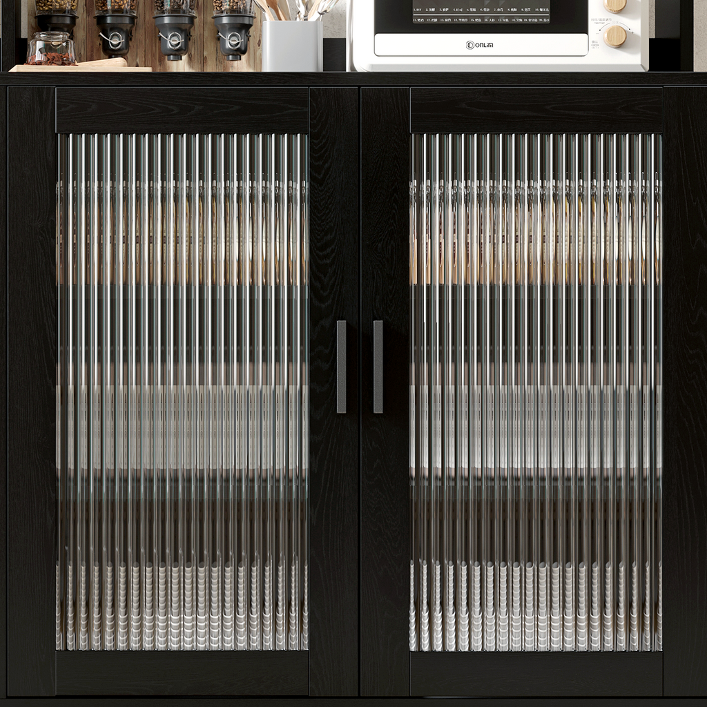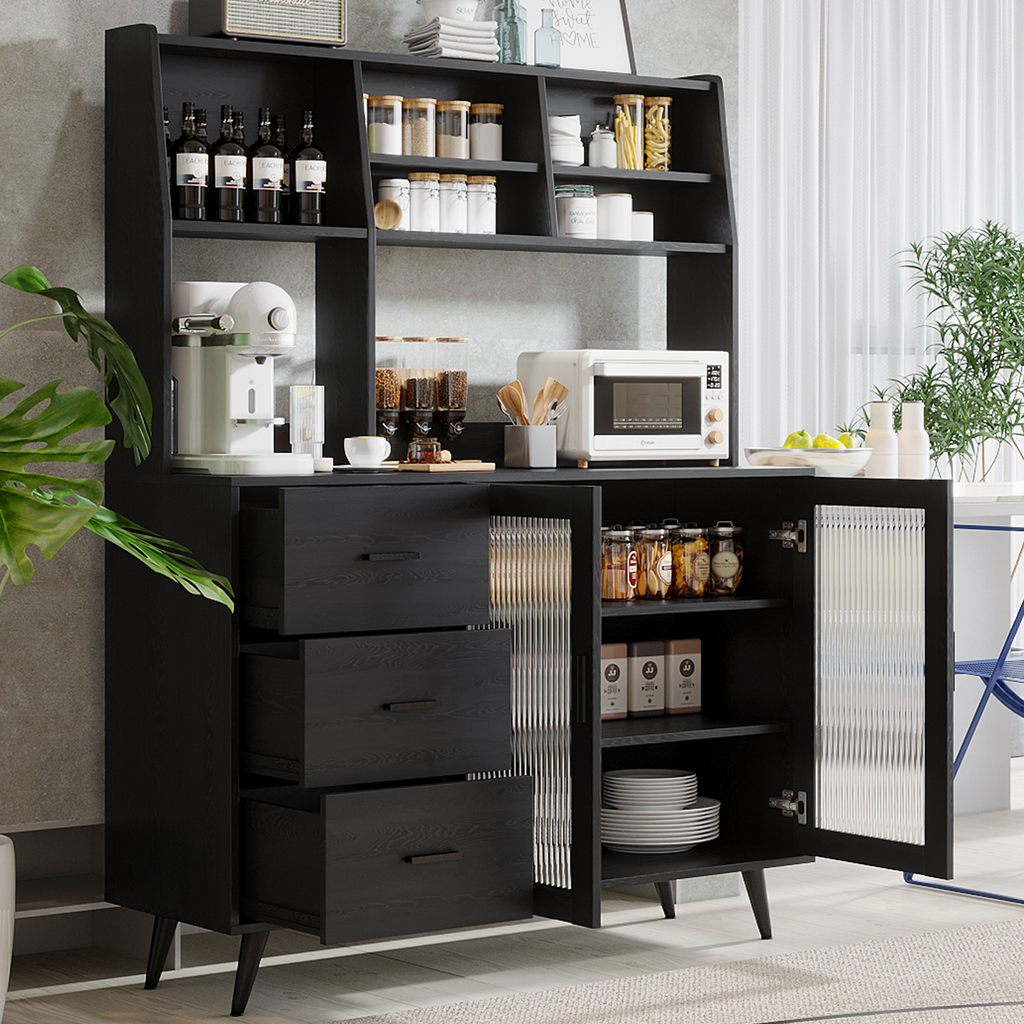 This kitchen pantry cabinet features a smart three - part design: the upper section with open, divided shelves is perfect for showcasing and accessing frequently used kitchen tools, spice jars, or small gadgets. The middle open platform serves as a practical workspace — ideal for placing active small appliances like coffee makers or blenders, or for temporarily holding freshly retrieved ingredients and tableware during meal prep. The lower section includes spacious 3 drawers (great for tucking away small utensils, napkins, or snacks) and ribbed glass - door cabinets that protect dishes, bowls, or dry goods from dust while keeping them visible at a glance