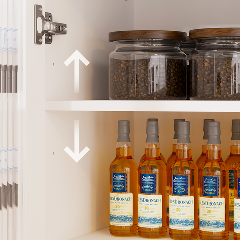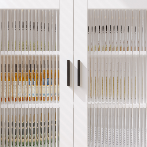 This kitchen pantry cabinet features a smart three - part design: the upper section with open, divided shelves is perfect for showcasing and accessing frequently used kitchen tools, spice jars, or small gadgets. The middle open platform serves as a practical workspace — ideal for placing active small appliances like coffee makers or blenders, or for temporarily holding freshly retrieved ingredients and tableware during meal prep. The lower section includes spacious 3 drawers (great for tucking away small utensils, napkins, or snacks) and ribbed glass - door cabinets that protect dishes, bowls, or dry goods from dust while keeping them visible at a glance