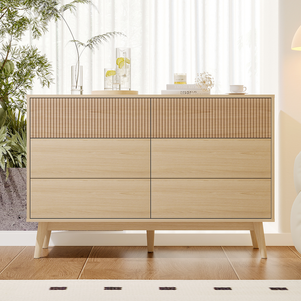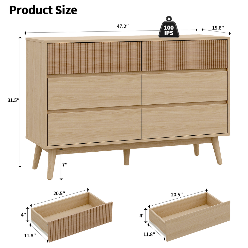 RichYa Fluted 6-Drawer Dresser for Bedroom, Chest of Drawers with Handle Free Design for Living Room,Natural Oak